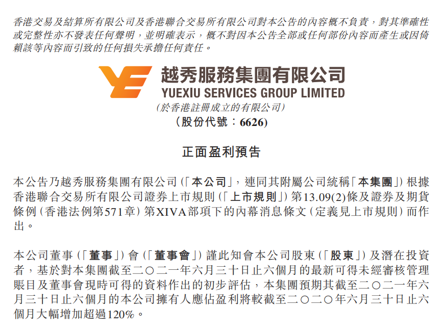 7月15日,304am永利服务集团有限公司(6626.HK)发布盈利预喜公告。公告称经过初步评估,集团预期截至2021年6月30日为止的六个月,公司拥有人应占盈利将同比大幅增加超过120%。